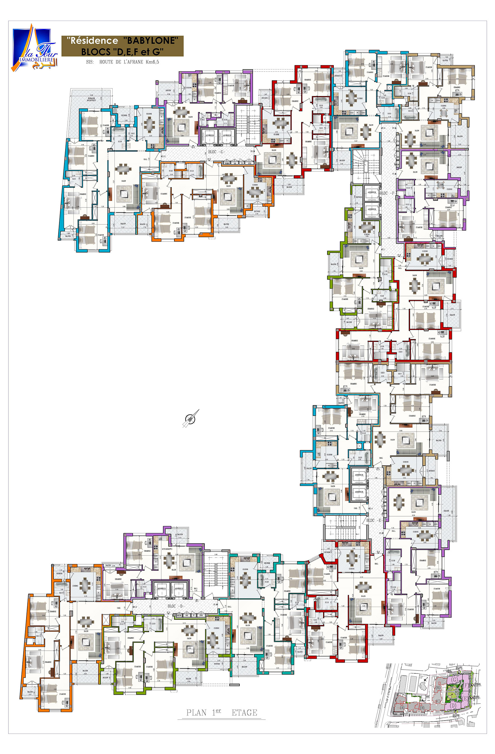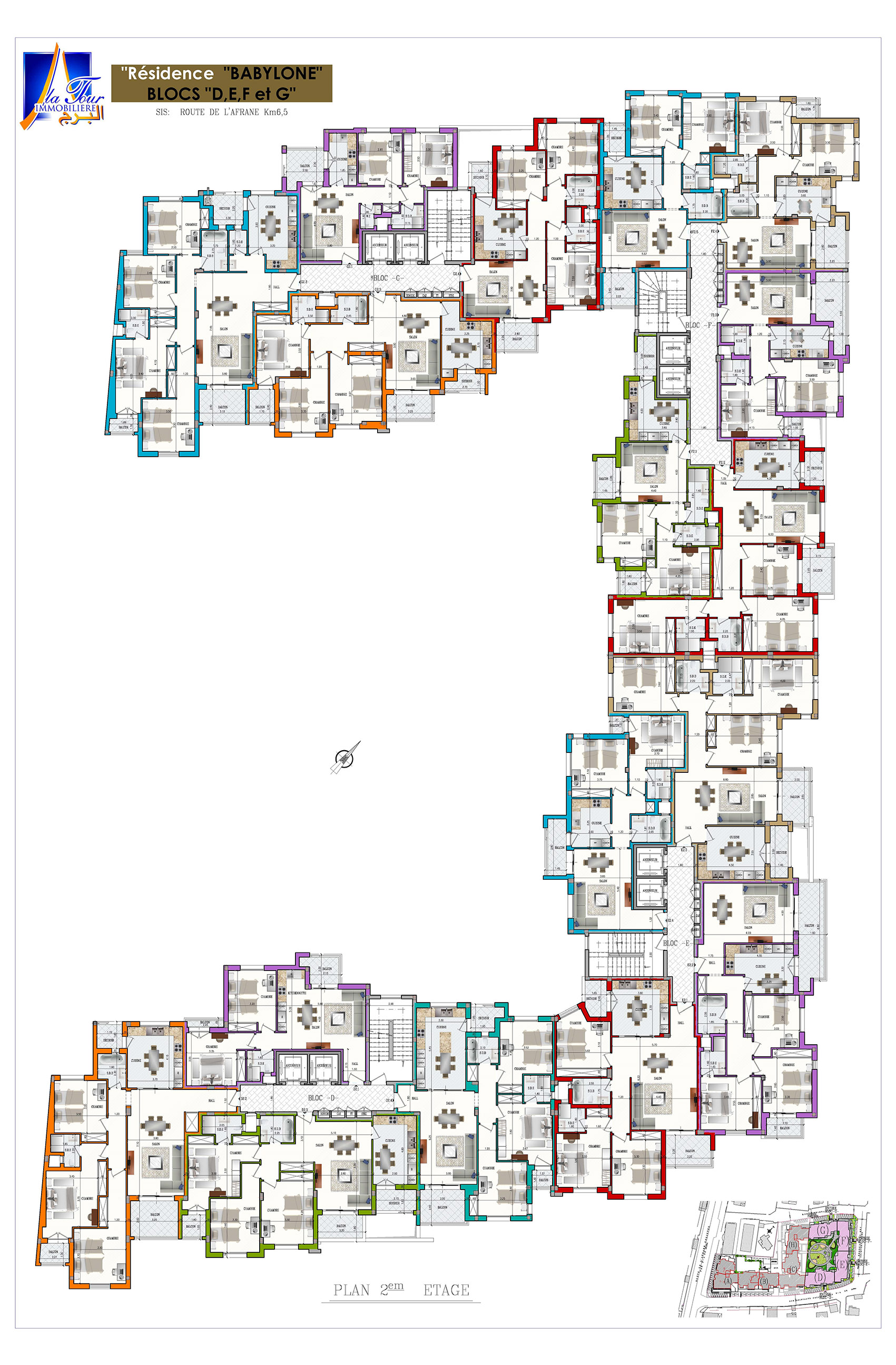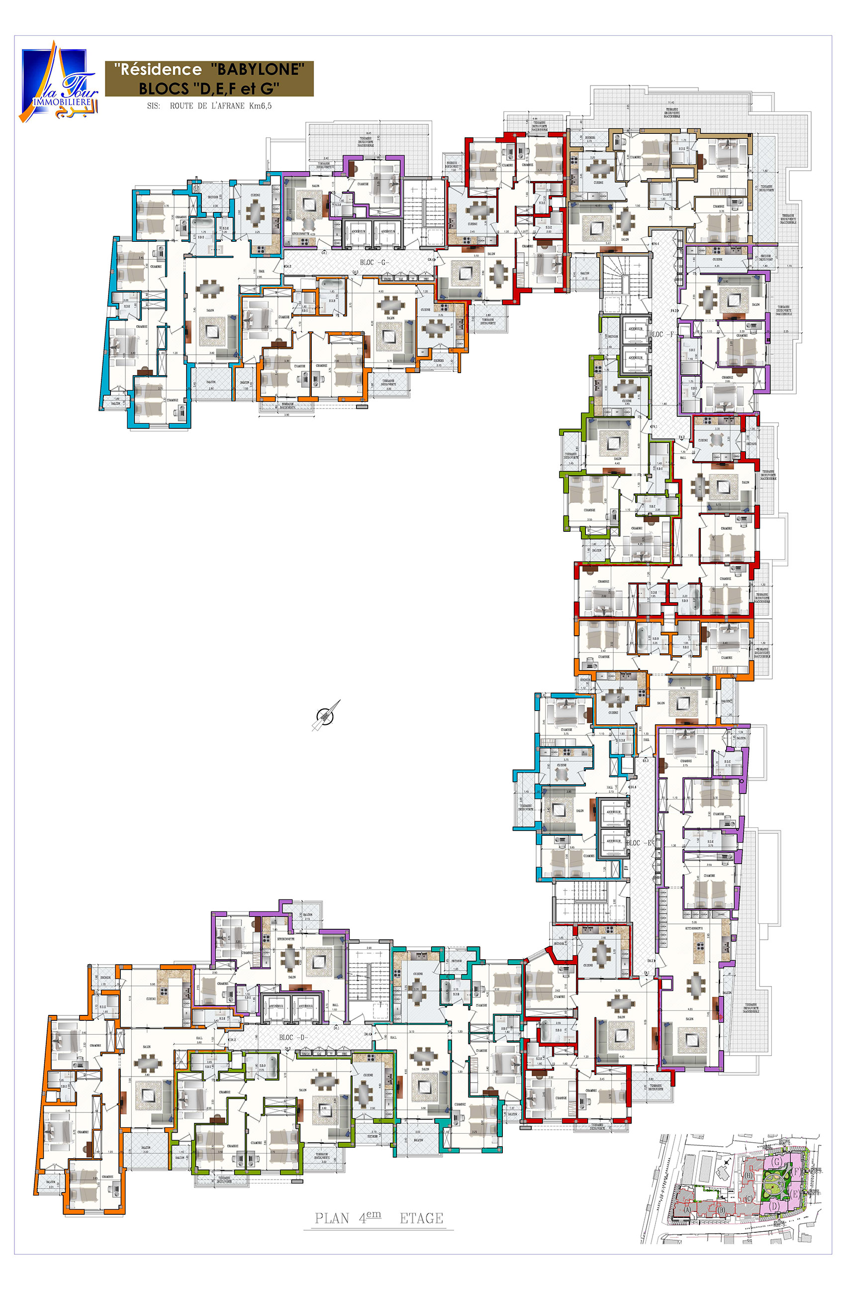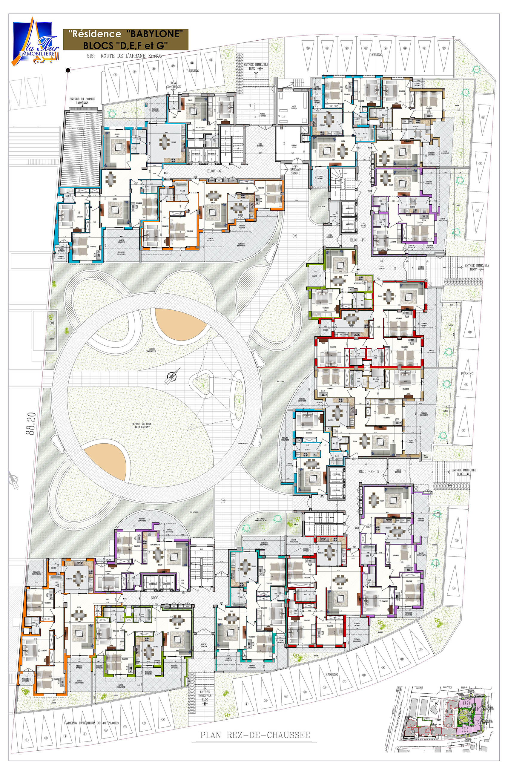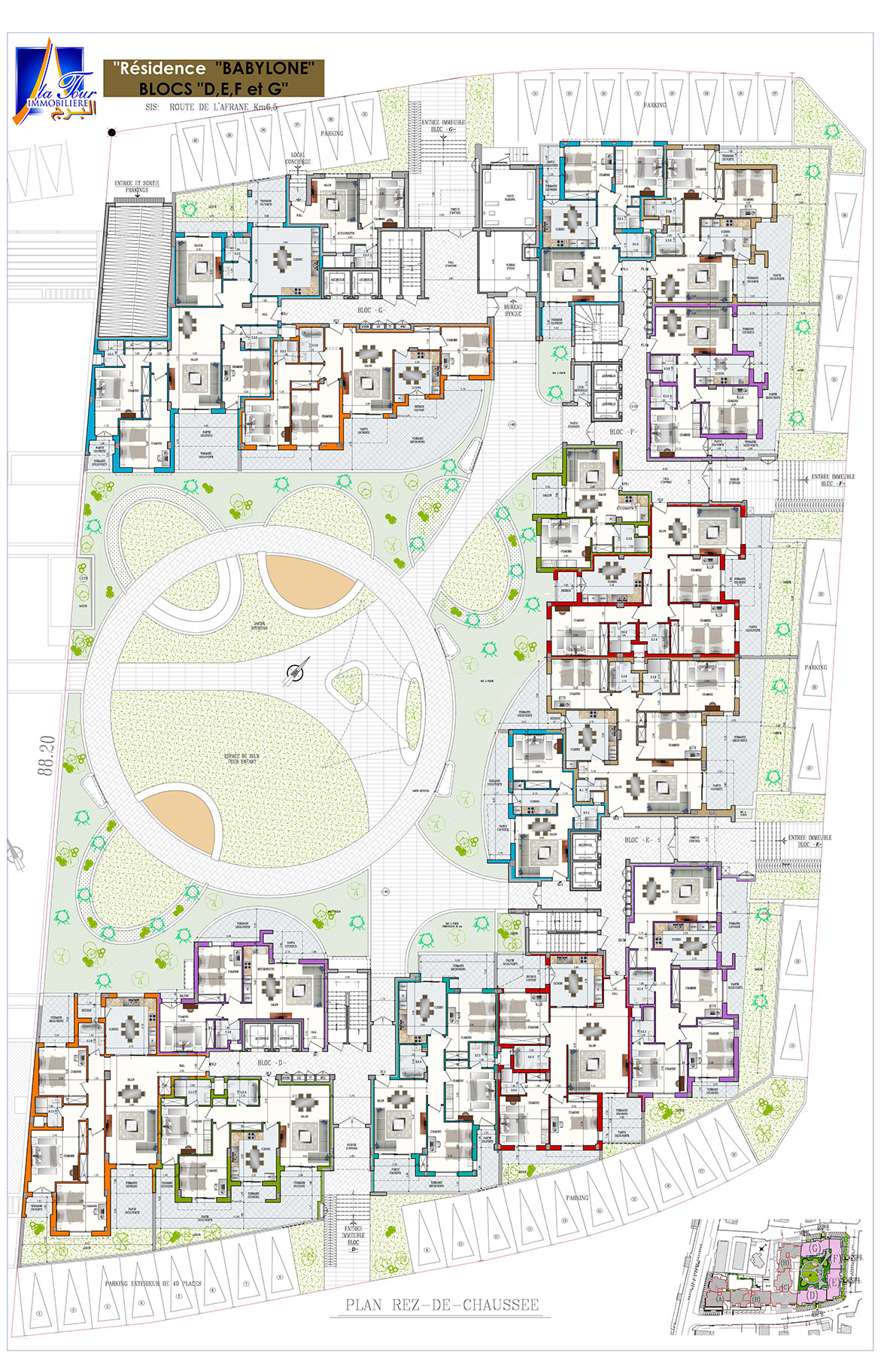 Cette dernière tranche du complexe immobilier Babylone est composée par 4 blocs (D,E,F,G) constituée par un sous-sol, RDC et 4 étages comportant :
